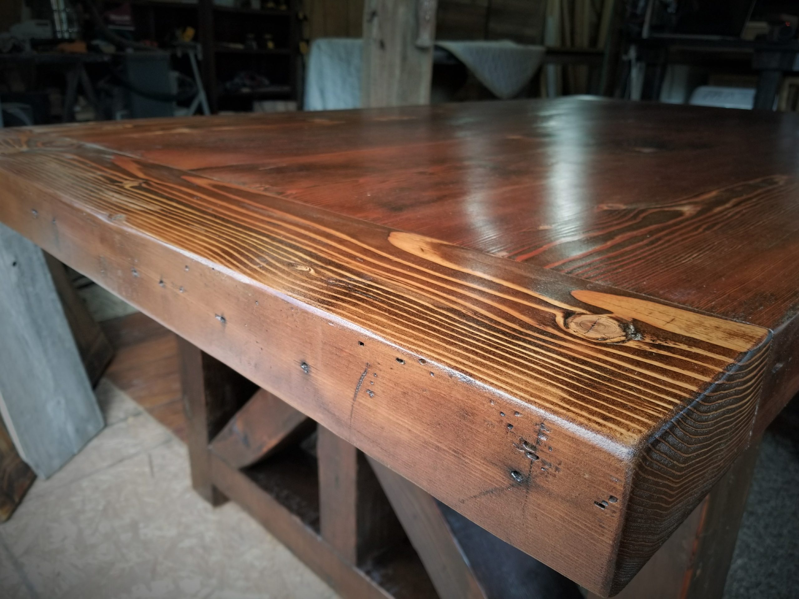 Reborn in 2018 – built from 1942 Iowa salvaged barn wood…it’s made from 2.5” thick barn planks for the top and 6” thick beams for the legs, all purchased from Rust Never Sleeps in Ft. Myers. You can see all the original nail holes where the planks were all originally connected when holding up the barn which RNS cleaned up. The character of this reclaimed farmhouse table is truly one of a kind. It’s finished in honey and has a matching hefty bench. This is the heaviest 6ft table to leave Jesus Tables to date and has been a blessing and a half to be able to work with such perfectly salvaged rare lumber. We hope to use more RNS reclaimed wood.